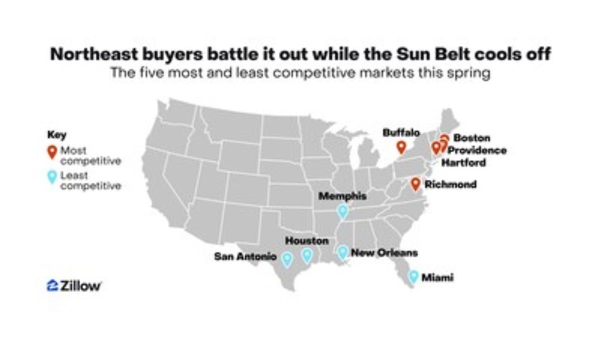 As the summer home-buying season heats up, a fresh Zillow analysis highlights just how much location influences the competition. In red-hot Northeastern markets like Boston and Buffalo, buyers are facing intense bidding wars — with more than 10 serious shoppers for every home on the market. Many of those homes sell within 10 days, and often above asking price.